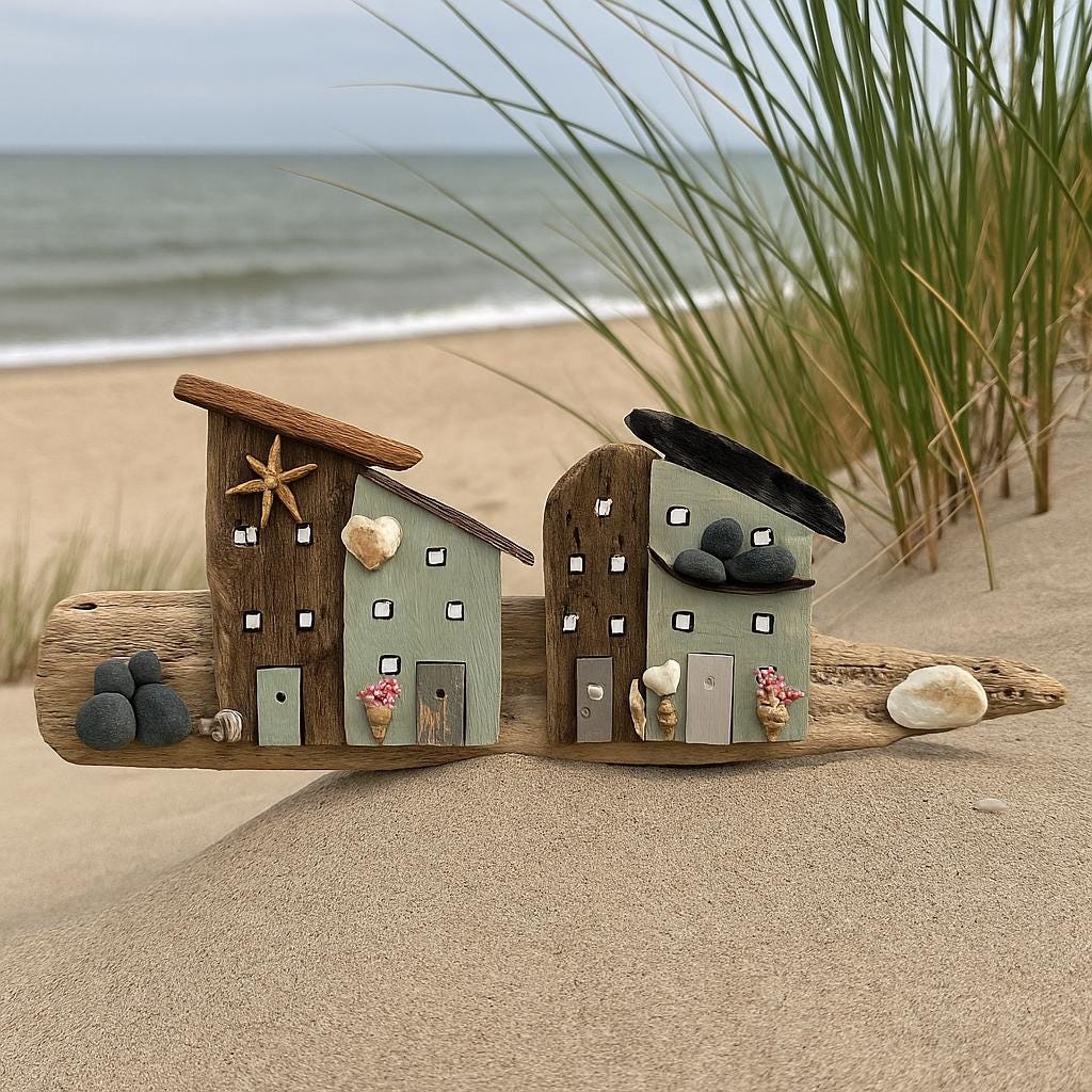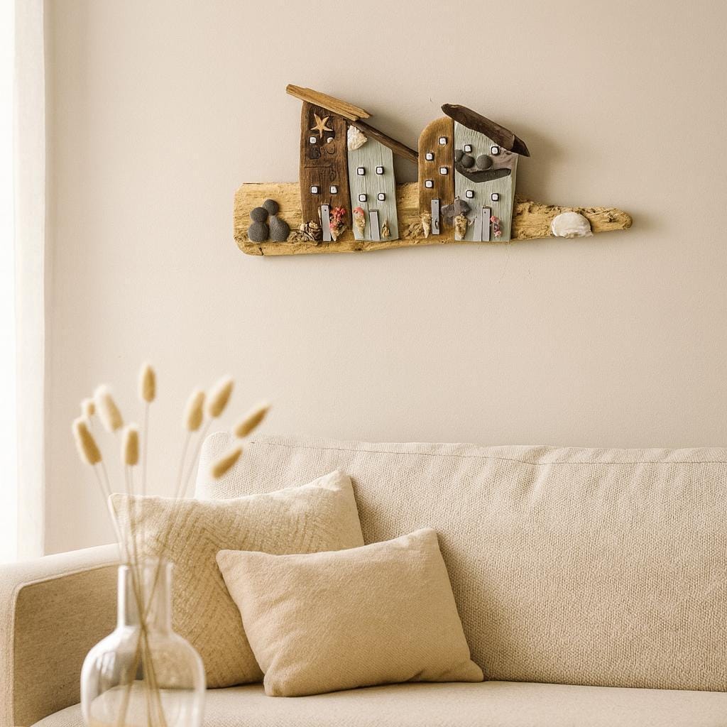 Dieses einzigartige Wandbild wurde aus echtem Strandgut der dänischen Küste gefertigt. Treibholz, kleine Steine und Muscheln wurden in liebevoller Handarbeit zu einem charmanten Küstendorf zusammengesetzt. Jedes Detail erzählt eine kleine Geschichte vom Meer und macht dieses Stück zu einem besonderen Blickfang für dein Zuhause.
