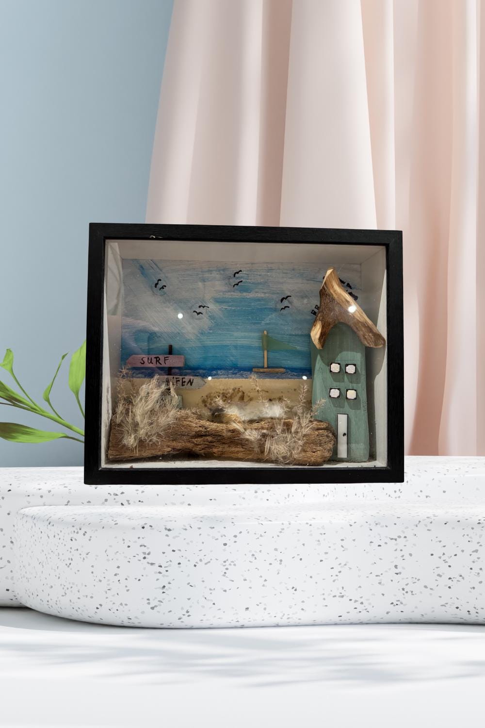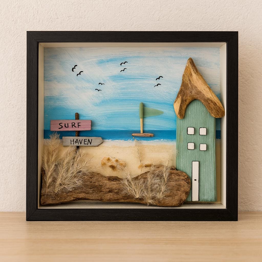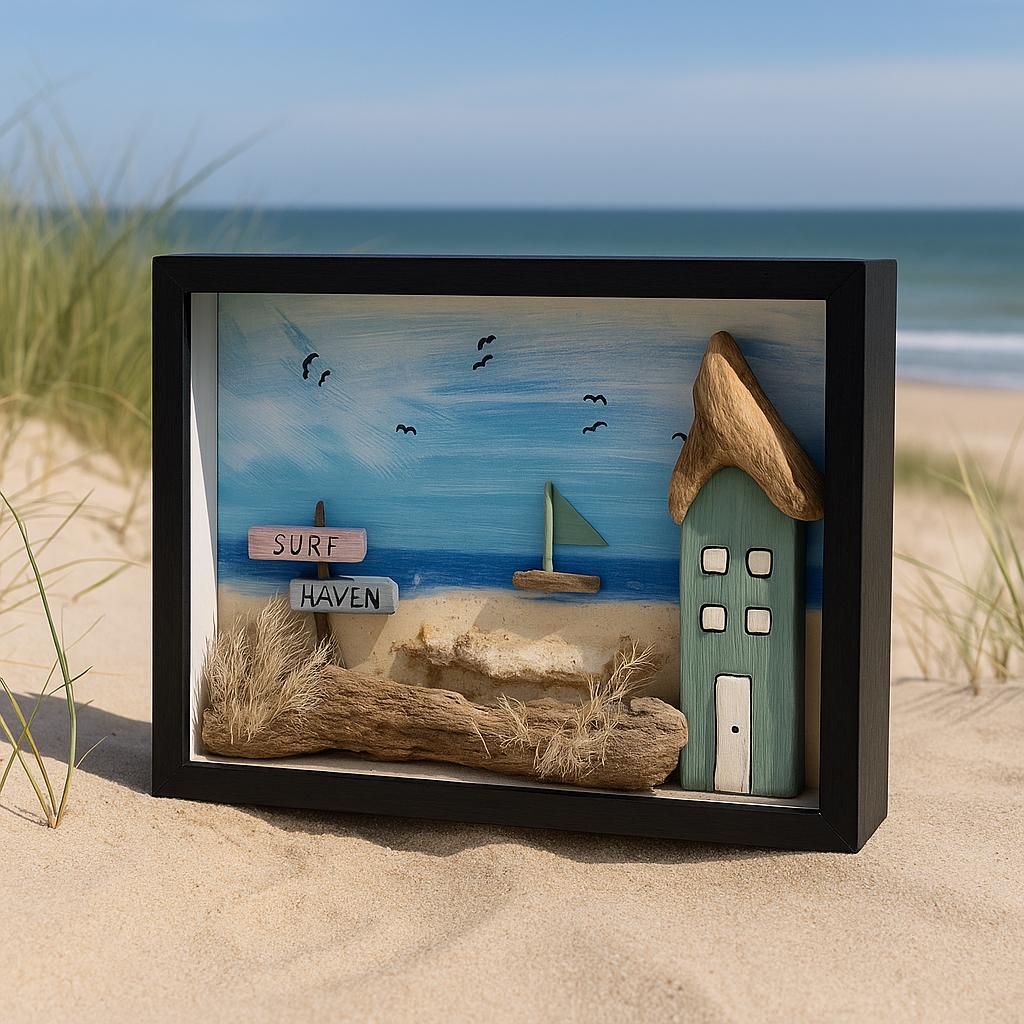 Im schwarzen Holzrahmen entsteht eine kleine maritime Welt: ein mintfarbenes Strandhaus mit natürlichem Treibholz-Dach, ein zart dargestelltes Segelboot auf ruhigem Meer und kleine Details wie Gräser und Schilder aus Strandgut („Surf Haven“) machen jedes Stück zu einem echten Unikat.