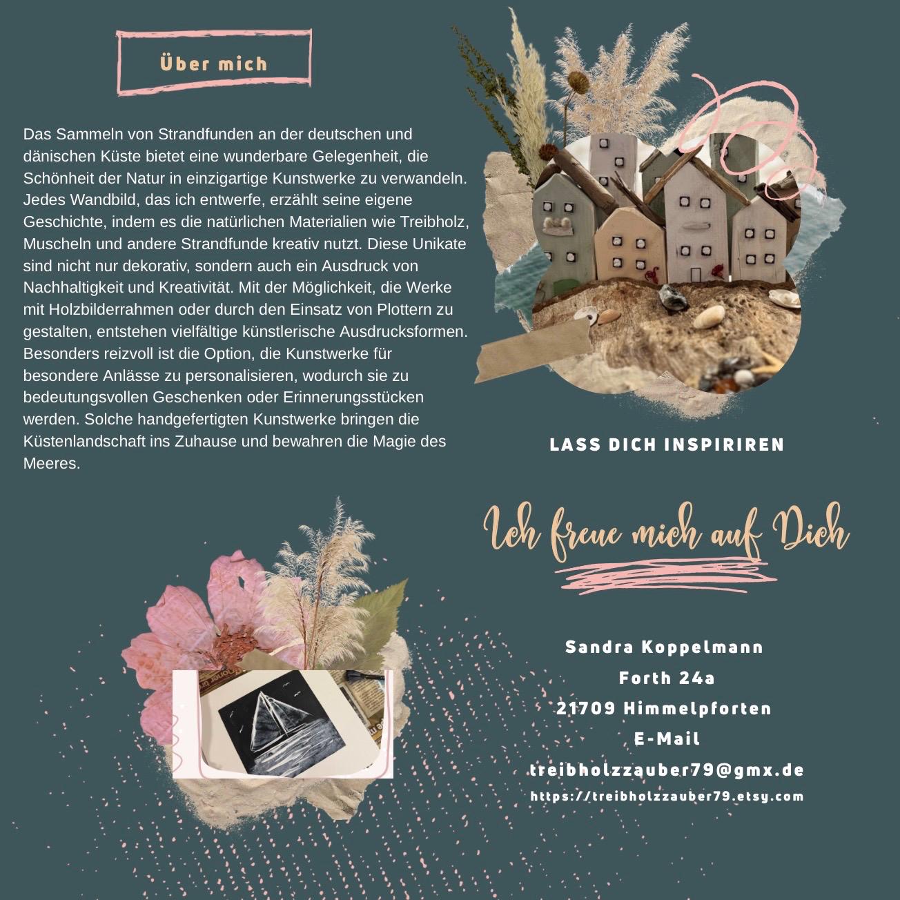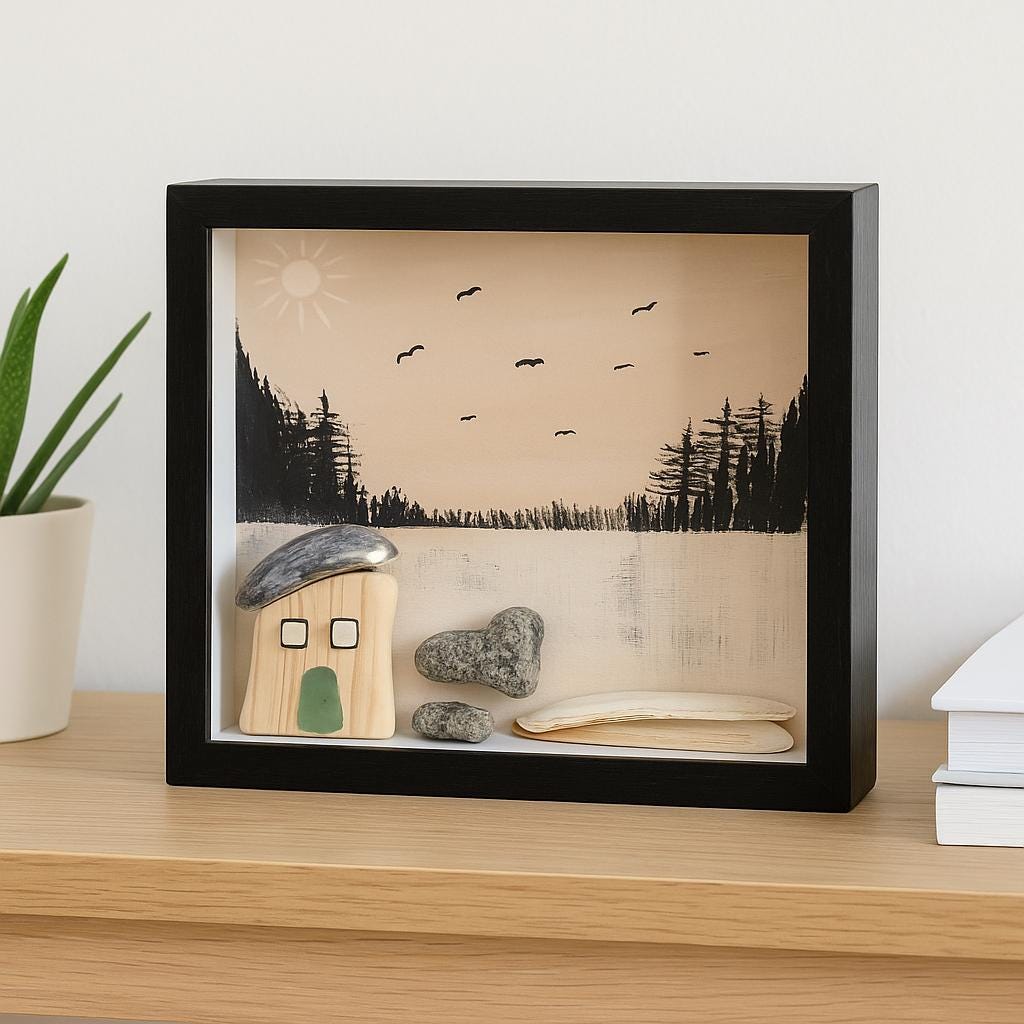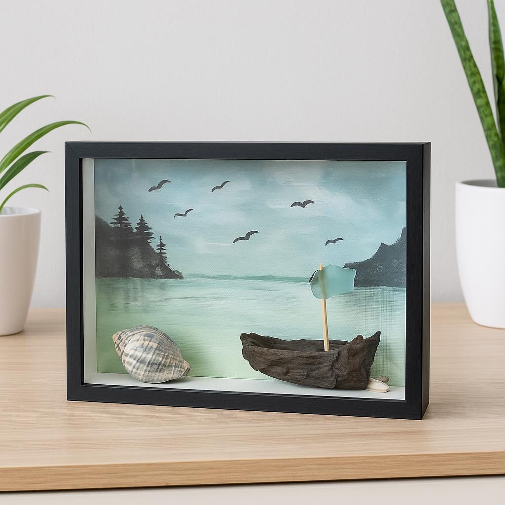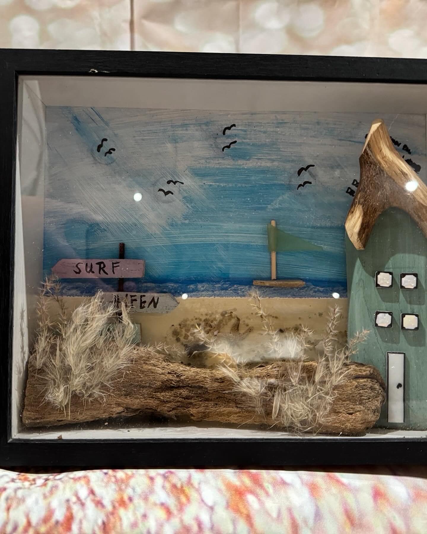 Im schwarzen Holzrahmen entsteht eine kleine maritime Welt: ein mintfarbenes Strandhaus mit natürlichem Treibholz-Dach, ein zart dargestelltes Segelboot auf ruhigem Meer und kleine Details wie Gräser und Schilder aus Strandgut („Surf Haven“) machen jedes Stück zu einem echten Unikat.